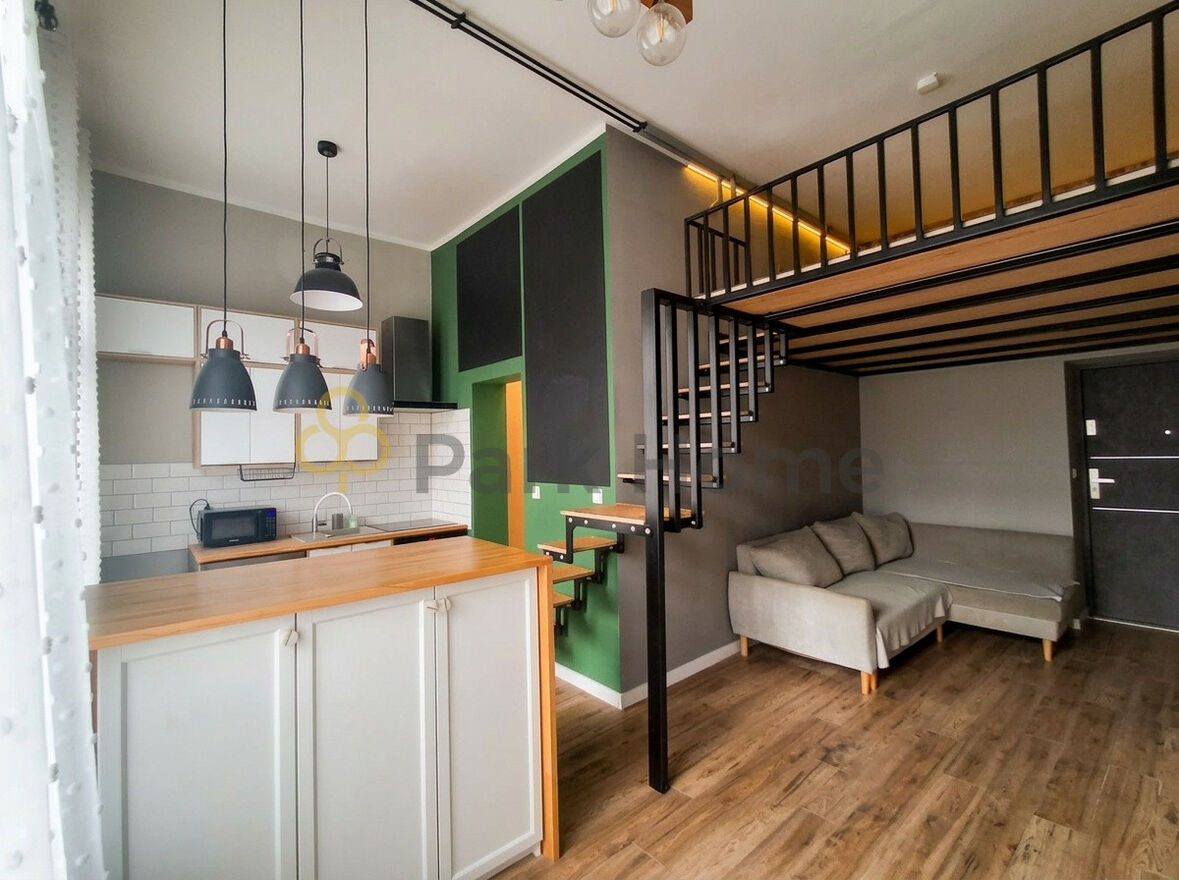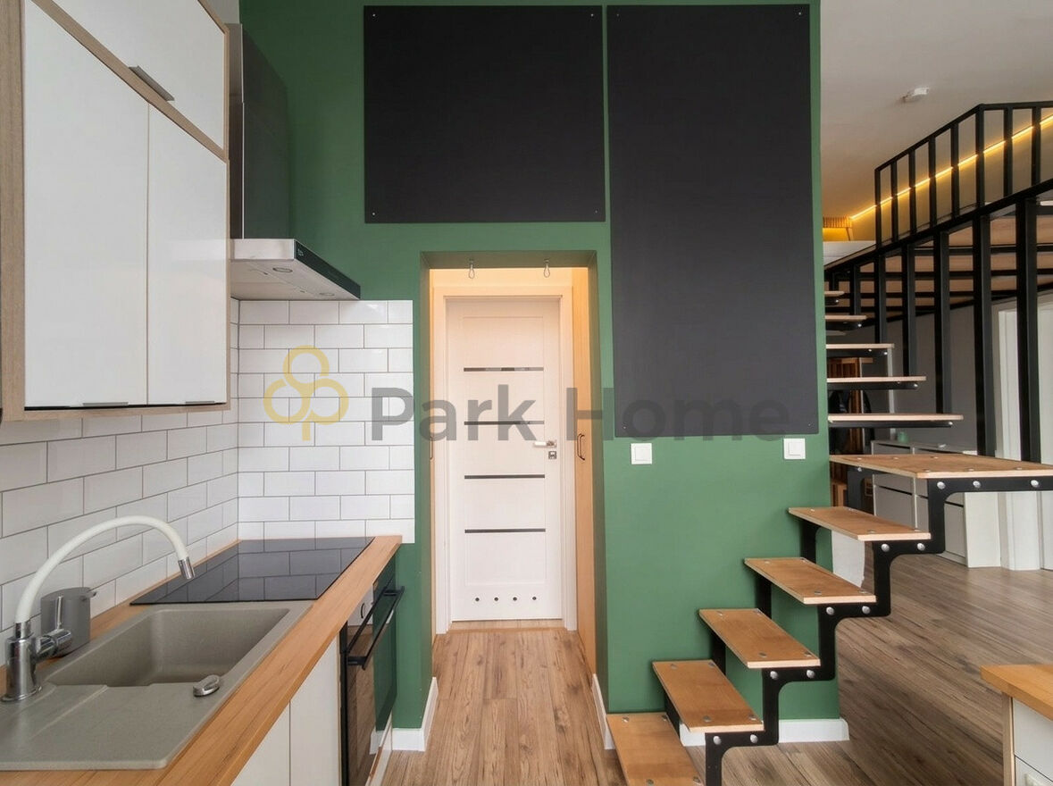 Mieszkanie wyróżnia się wysokością sufitów, co pozwoliło na stworzenie funkcjonalnej antresoli. Wnętrze urządzono w nowoczesnym stylu z elementami industrialnymi. Salon połączony z aneksem kuchennym przyciąga wzrok modną butelkową zielenią ścian oraz tablicową powłoką, która nadaje wnętrzu personalny charakter. Kuchnia wyposażona jest w eleganckie białe szafki, stylowe płytki typu "metro" oraz drewniane blaty, które ocieplają przestrzeń.